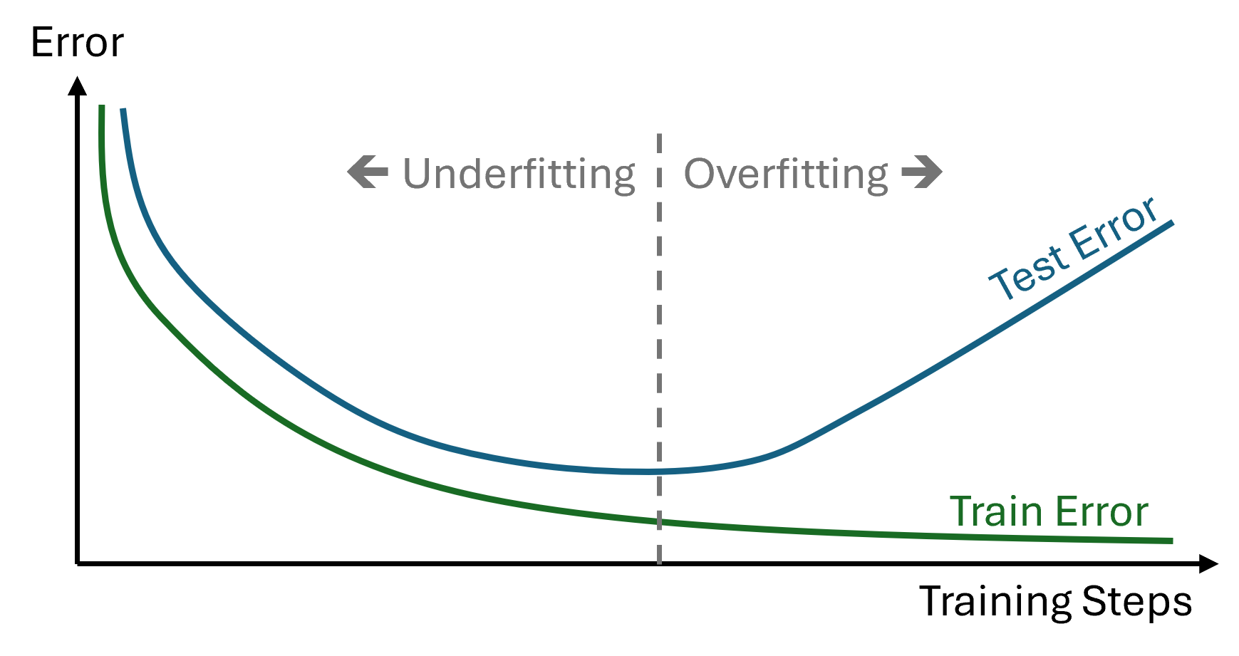 Any introductory ML course will present chart illustrating the performance of a model on a training set and a test set as training progresses. Performance on the training set is proxy for how much further training is possible. Performance on the test set is a proxy for expected performance on novel data during deployment, which is the actual metric we care about. This graph has two key takeaways: first, that model performance on novel data improves only to a point, after which it gets worse (through overfitting). Second, there is a gap between the performance on the training and test data, referred to as the generalization gap.