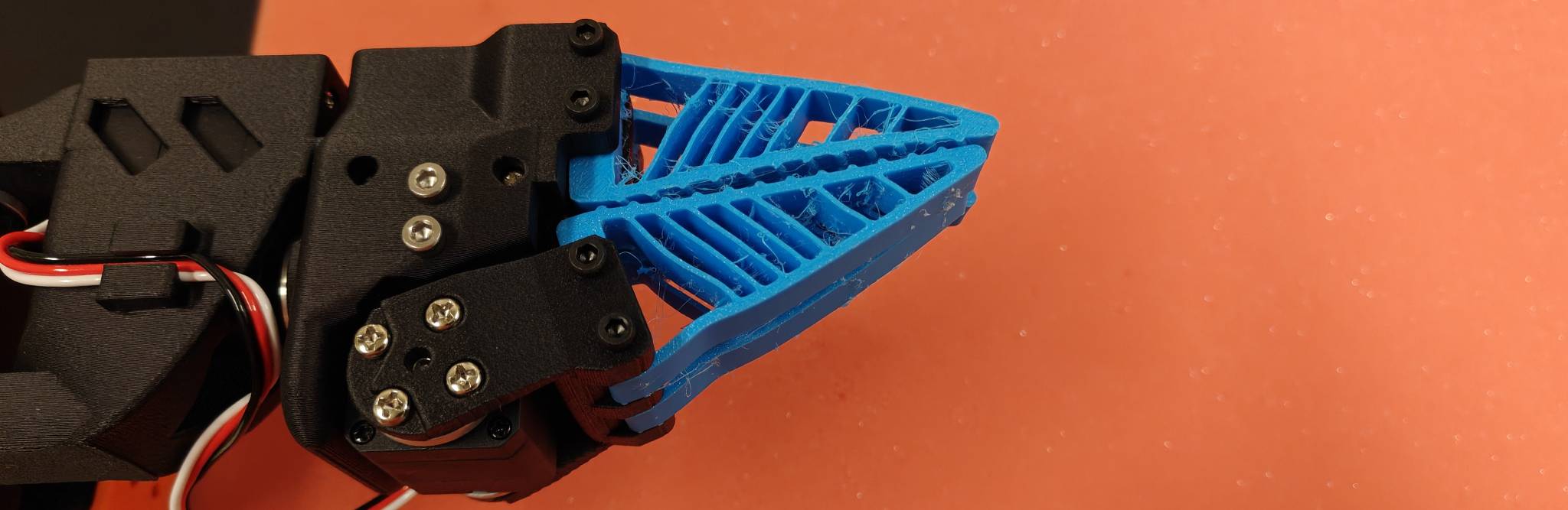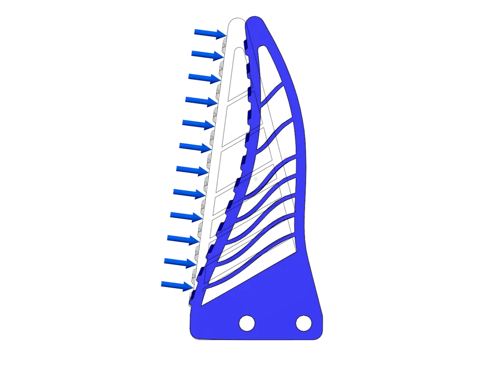 Unlike most standard fin-ray grippers, we use slanted ribs and an angled bottom to further control the direction of buckling. We FEA simulations in Autodesk Fusion of a bunch of geometries to observe the behaviour under load.